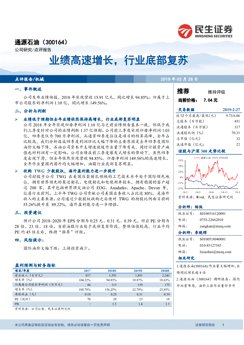 预计公司2018~2020年EPS分别为0.25元、0.31元、0.39元,对应PE分别为28倍、23倍、18倍。当前油服行业处于底部复苏阶段,整体估值较高,行业平均PE约45倍左右,维持“推荐”评级。